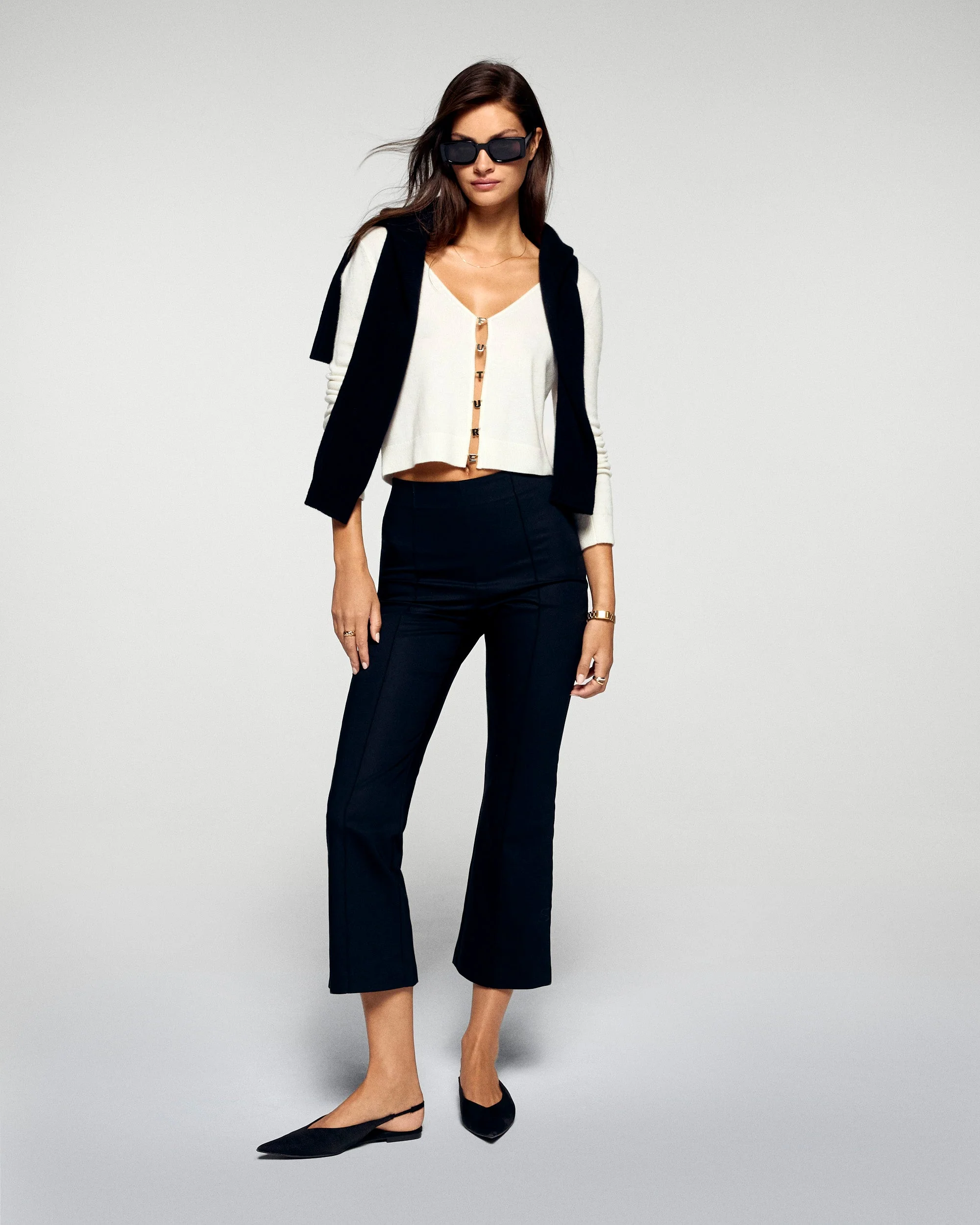 Crafted from cashmere, this fitted top is adorned with a statement "Future" jewel button closure. Featuring a flattering V-neckline and long sleeves, pair it with your favorite skirt for a bold and sophisticated look.