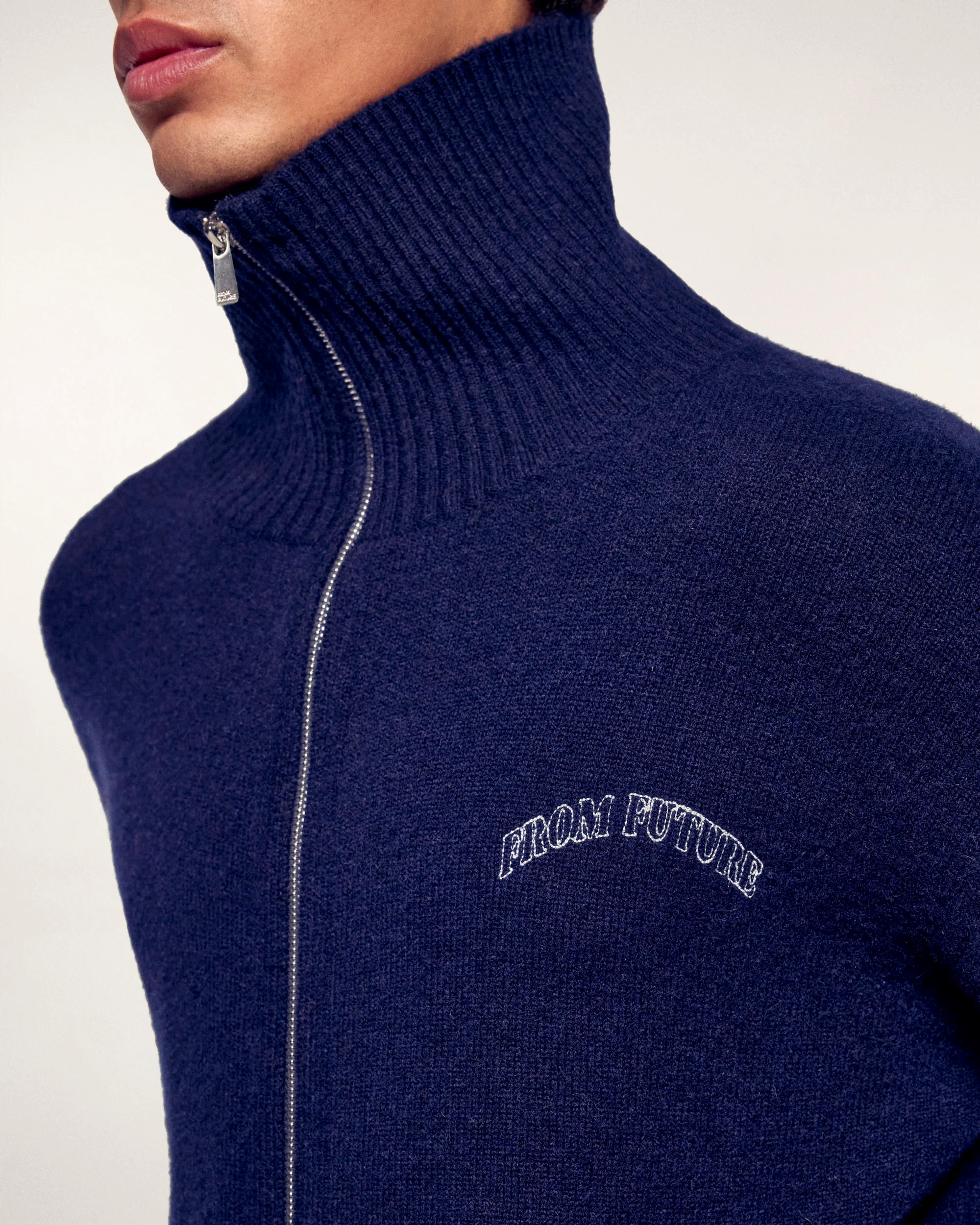 This zipped cardigan is crafted from pure cashmere, ensuring exceptional warmth and softness. Its classic cut and mock neck make it a timeless piece, enhanced by the signature "FROM FUTURE" embroidery.